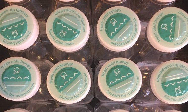 Mimica Touch contains a gelatine that is calibrated to degrade at the same rate as the product inside, revealing bumps as it spoils. The premise is straightforward: if the gel is smooth, the food is edible; if it’s bumpy, then it’s a no go. Initially, the gelatine was animal-based, causing an uproar amongst campaigners. Mimica listened, and true to their nature, adopted a plant-derived alternative - earning them vegan certification. Whilst the labels are compatible with dairy, meat and juice products, Mimica are also branching out to develop labels to help safely store COVID vaccines.